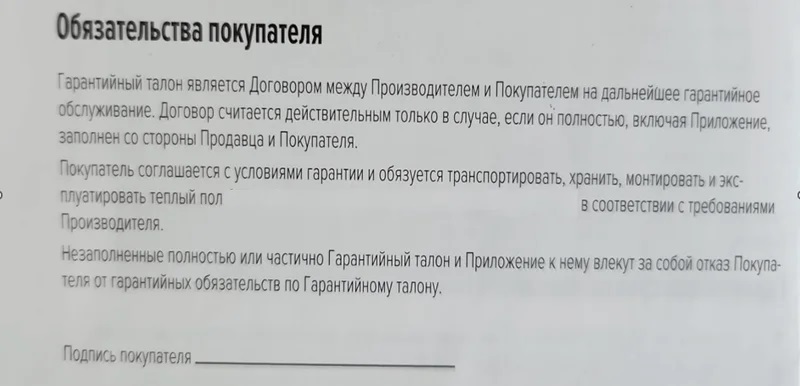 А это выдержка из паспорта теплого пола другого производителя. Компания письменно вводит покупателя в заблуждение, требуя обязательного заполнения гарантийного талона. Тем самым она перекладывает ответственность на продавца и покупателя.