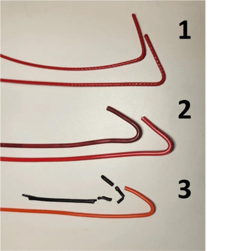 Проверка провода при сгибе: в синем используется однопроволочная жила, в оранжевом — многопроволочная