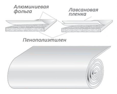 Материал состоит из двух слоев: основания и фольги. Основой могут служить минеральные или полимерные утеплители. Волокнистая или пузырчатая структура препятствует тепловым потерям, так как имеющийся в них воздух снижает коэффициент теплопроводности материала. Верхний слой может быть выполнен из фольги или иметь тонкое алюминиевое напыление. Подложка с напылением дешевле, но и ее качество ниже.