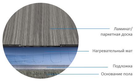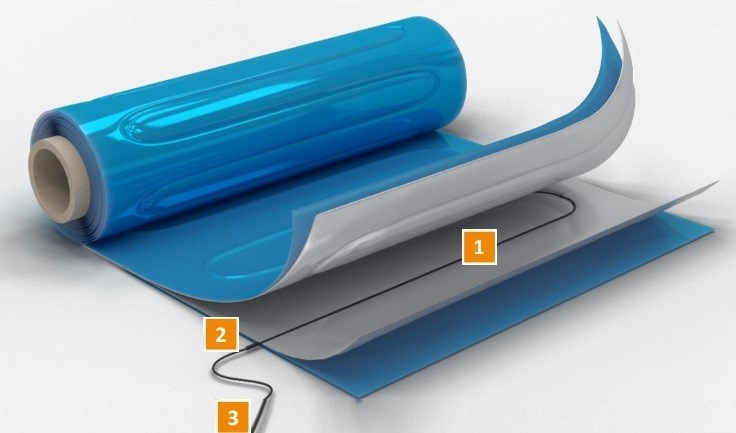 Сверху на подложку укладываются нагревательные элементы и напольное покрытие.