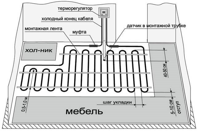 Далее чертят схему раскладки кабеля, отмечают место установки регулятора, датчика температуры пола, соединительных и концевых муфт. Если на обогреваемой площади имеются термокомпенсационные швы, то схема раскладки планируется так, чтобы нагревательная секция их не пересекала. Монтажные концы должны быть подведены к терморегулятору. При планировании раскладки одножильного кабеля теплого пола необходимо учитывать, что к регулятору нужно подвести два установочных провода.