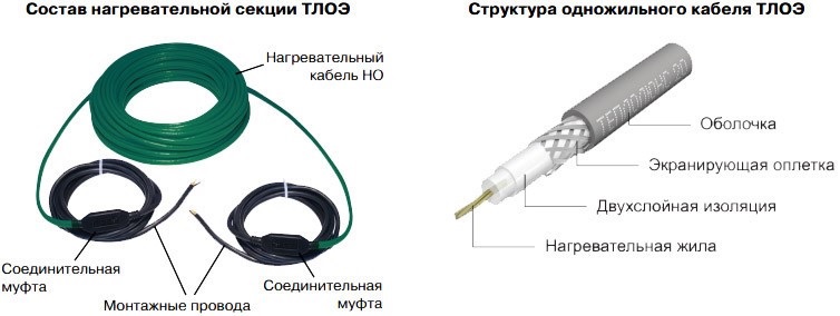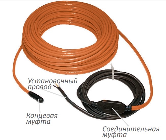 Изделие состоит из кабеля с одной нагревательной жилой, соединительными муфтами и монтажными проводами с двух сторон. Кабель имеет двухслойную изоляцию и экранирующую оплетку, которые дают механическую и электрическую защиту. Соединительные муфты надежно герметизируют места соединения нагревательной жилы и экрана с двумя медными проводами монтажного конца. Оба монтажных провода должны подвиться к месту подключения к питанию и терморегулятору.