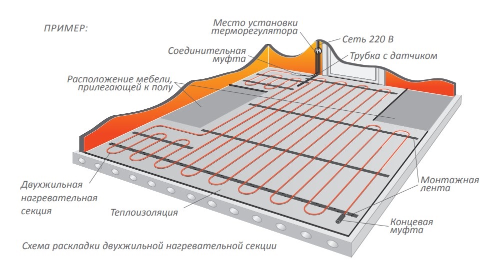 Монтаж и одножильной, и двухжильной нагревательной секции проходит в несколько этапов: