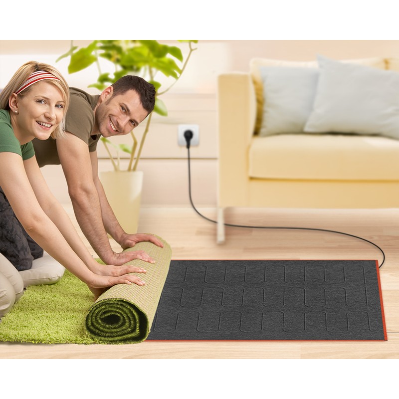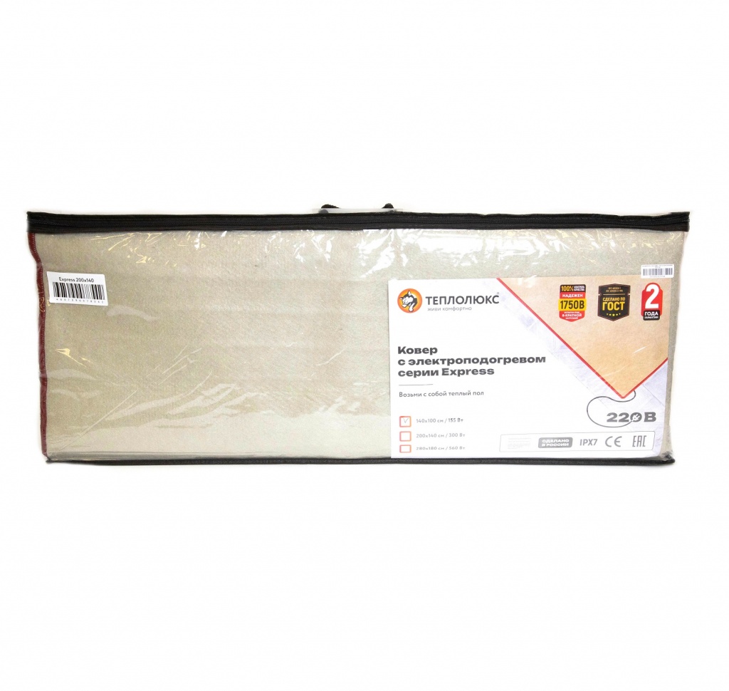 Рекомендуются ковры с низким ворсом, безворсовые и тафтинговые (плетеные) ковры. «Теплолюкс Express» выпускается в трех габаритных исполнениях 2,0×1,4 метра, 2,8×1,8 метра и 1,0x1,4 метра, которые подходят под стандартные размеры напольных ковров.