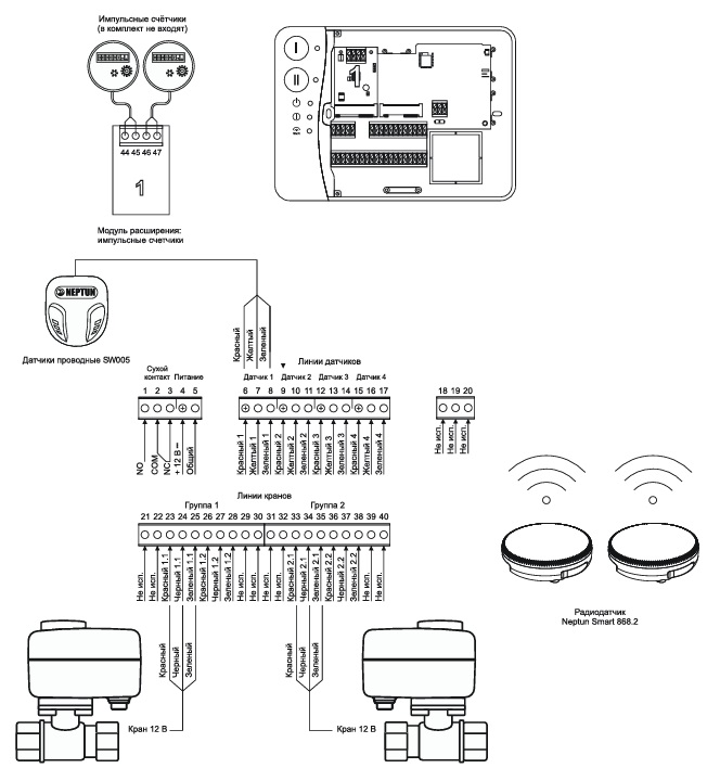 Модуль управления Neptun Smart+ Tuya считывает сигналы от датчиков контроля и управляет кранами, установленных в системах водоснабжения.
